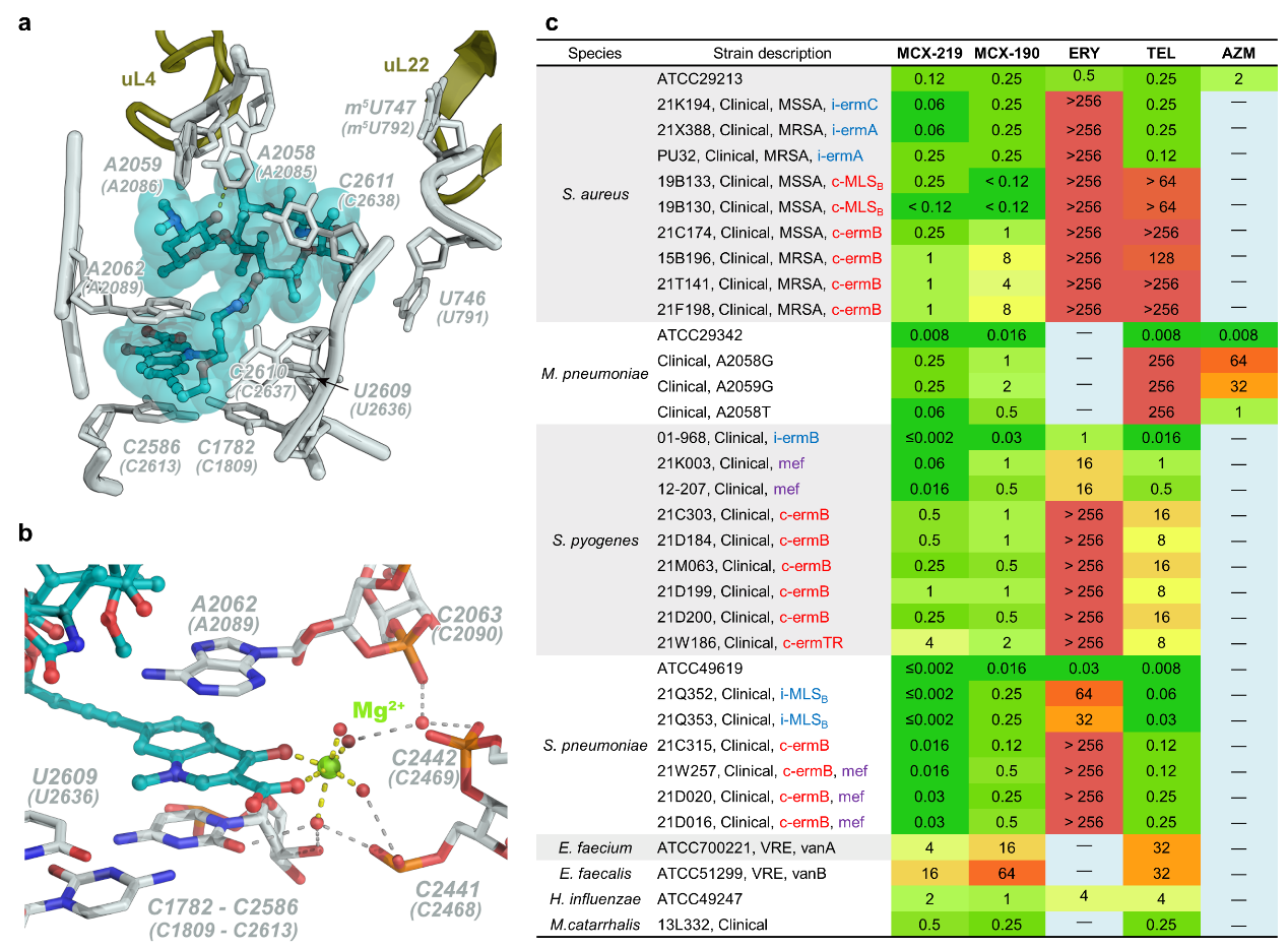梁建華團隊將大環內酯與喹諾酮通過特定的側鏈連接,得到了作用于核糖體新位點C2586-C1782的新型大環內酯MCX-219和MCX-190,對各種耐藥菌具有優異的抗菌活性,目前尚未有任何一種MLSB類抗生素報道作用該位點。經冷凍電鏡解析復合物結構發現MCX-190與野生型和耐藥型金黃色葡萄球菌核糖體均能產生穩定的結合,不受A2058是否受甲基化影響(圖 a),喹諾酮骨架與核糖體A2062與C2586-C1782形成穩定的“三明治”結構,喹諾酮的酮酸結構與堿基磷酸骨架通過水和鎂離子介導形成氫鍵(圖b),該結構完全阻塞新生肽輸出通道,因此對于組成型erm的金黃色葡萄球菌以及堿基突變的耐藥支原體具有很好的抗菌活性。選取2021年在全國收集的不同種類耐藥菌進行抗菌活性測試驗證了化合物的高活性(圖c)。化合物在原核細胞比在真核細胞抑制蛋白質翻譯具有高選擇性,比泰利霉素呈現更優的體外抗菌活性,覆蓋耐藥病原菌廣,且具有病原菌細胞累積高,人源細胞毒性低,血藥和肺部組織濃度高的優點。