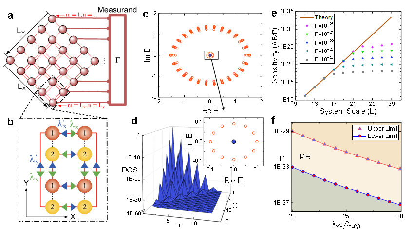 為了驗證該理論方程的準確性,研究人員進行了相應(yīng)的數(shù)值仿真與理論計算,相關(guān)數(shù)據(jù)展示在圖1e和1f中。通過數(shù)值仿真和理論曲線的可以清晰看出,理論推導(dǎo)結(jié)果符合數(shù)值仿真結(jié)果,系統(tǒng)的靈敏度隨著系統(tǒng)的尺度增大而增大。不同的是,在尺度增長到一定范圍后,系統(tǒng)的靈敏度數(shù)值上會出現(xiàn)一定的飽和效應(yīng),如圖1e所示。該飽和效應(yīng)是由于待測物理量的數(shù)值過大,放大后的能量偏移具有上限,不代表系統(tǒng)的靈敏度會受到限制,所以在待測量無窮小時,系統(tǒng)的靈敏度會完全如理論方程式所示,隨著系統(tǒng)尺度而指數(shù)增長。同時,圖1f給出了系統(tǒng)的靈敏度隨著系統(tǒng)耦合參數(shù)的變化情況,可以看到在一定的范圍內(nèi)通過調(diào)節(jié)系統(tǒng)的耦合參數(shù),系統(tǒng)的靈敏度可以在小范圍內(nèi)精細調(diào)節(jié),這種特性使該系統(tǒng)在應(yīng)用層面有更多的可調(diào)性,可以適用于更多種復(fù)雜的應(yīng)用場景。