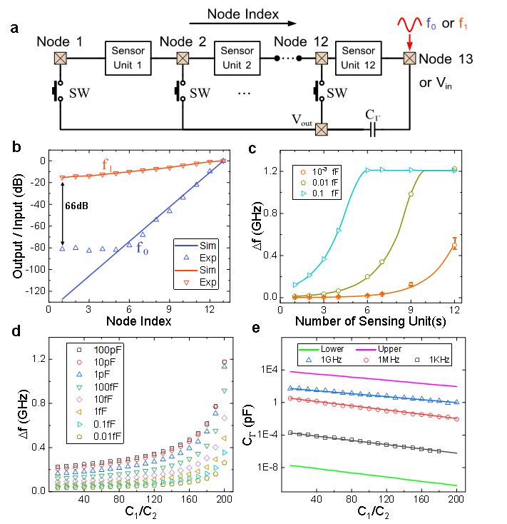 研究人員在圖3中展示了所設(shè)計傳感芯片的控制模塊和具體性能參數(shù),圖3a中展現(xiàn)了基于FPGA技術(shù)實現(xiàn)的系統(tǒng)模塊控制,可以通過控制測量端口所連接的開關(guān)SW實現(xiàn)系統(tǒng)在多種靈敏度模式的切換。通過研究人員的實驗測試和標定,系統(tǒng)可以非常清晰地展現(xiàn)出指數(shù)級別的趨附效應(yīng)(圖3b),同時,該芯片可以精確測量容值為到的標準電容(圖3c-3e)。事實上,對于