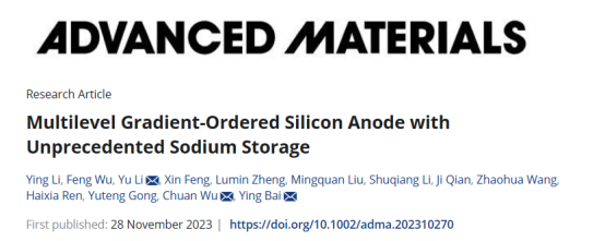 編輯:牟雪嬌 審核:程興旺 閱讀次數:北京理工大學材料學院白瑩教授研究小組在鈉離子電池負極材料研究中取得重要進展,11月28日,相關研究成果以“Multilevel Gradient-Ordered Silicon Anode with Unprecedented Sodium Storage”為題在國際知名期刊 Advanced Materials 上發表。北京理工大學材料學院白瑩教授、吳川教授和李雨副研究員為本論文共同通訊作者,材料學院博士后李瑩為第一作者。