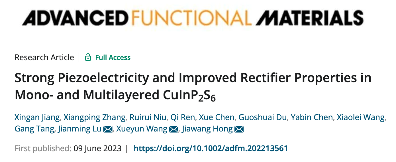 編輯:趙亞康 審核:龍騰 閱讀次數:近日,北京理工大學宇航學院洪家旺教授、王學云副教授團隊報道了單原子層厚度的二維范德瓦爾斯CuInP2S6鐵電材料面外強壓電性效應以及增強的電流自整流特性,相關成果以“Strong Piezoelectricity and Improved Rectifier Properties in Mono- and Multilayered CuInP2S6”為題,發表于國際頂級學術期刊《Advanced Functional Materials》。