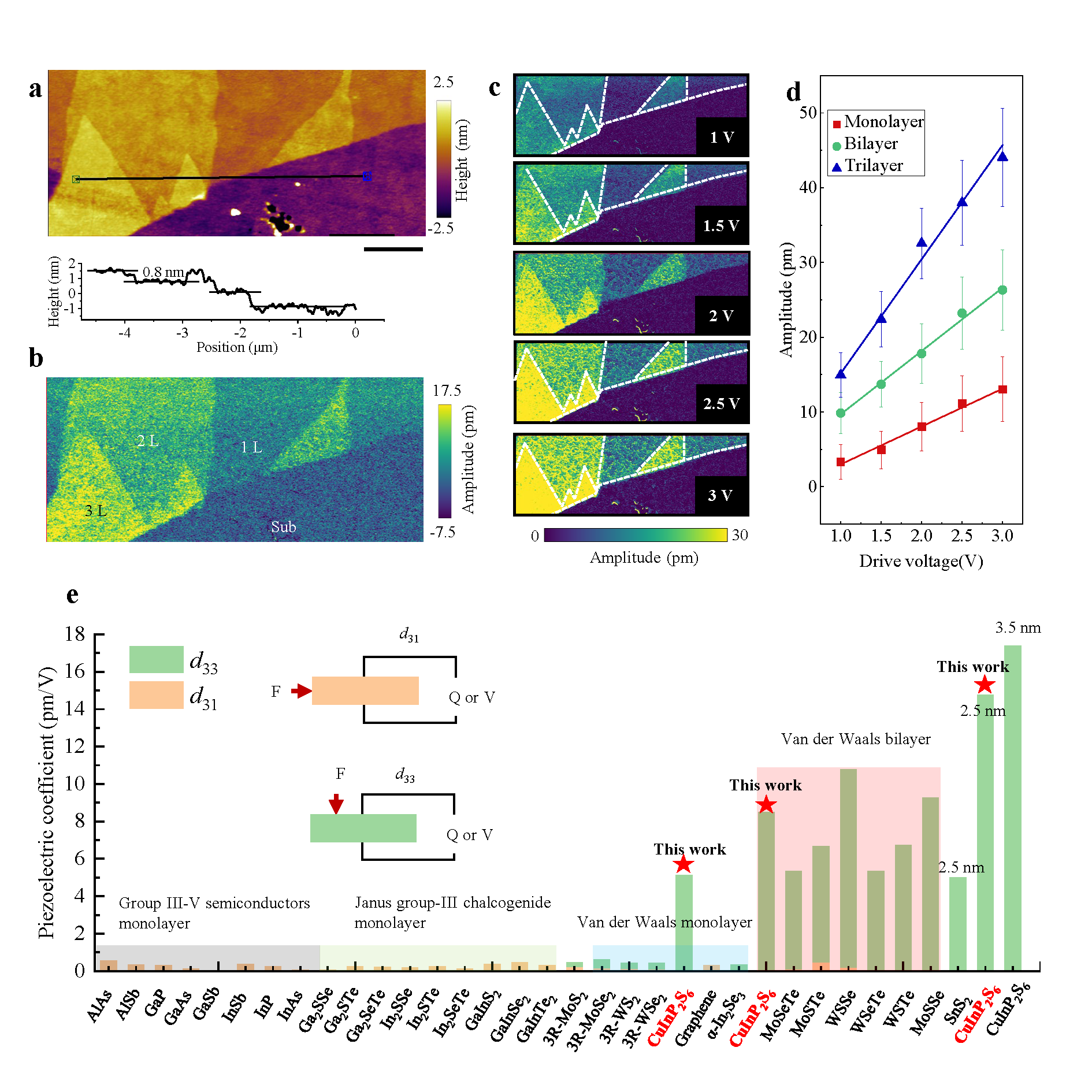 我校宇航學院洪家旺、王學云教授團隊基于在范德瓦爾斯鐵電體CuInP2S6體系前期研究基礎上(Nature Communications, 2022, 13: 574;Small, 2020, 16: 1904529),進一步報道了首次成功剝離制備出單原子層厚度的CuInP2S6鐵電材料,并發現其在面外方向上的強壓電性,遠高于現有單層壓電材料 (圖1)。
