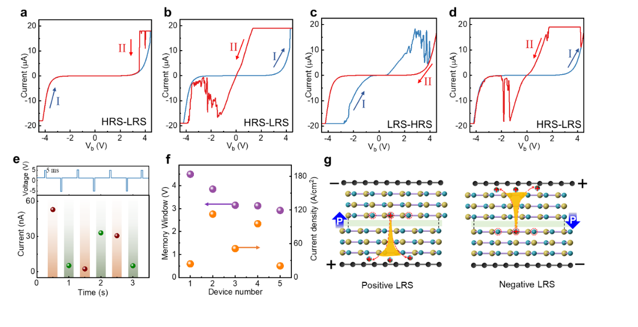圖3展示了滑移憶阻器中的記憶窗口。圖a-d展示了PS-BN中HRS和LRS之間的切換,顯示了可逆的大記憶窗口。圖c展示了器件可以在電場的同一方向上從LRS切換到HRS,這與基于金屬電極的憶阻器不同。圖e展示了在5ms內分別用 5V和 -5V的脈沖電壓對滑移憶阻器進行編程和擦除。圖f展示了幾個器件的記憶窗口大小和電流密度的匯總。圖g展示了帶正電荷的硼離子在兩個界面極化運動時形成導電絲的示意圖。