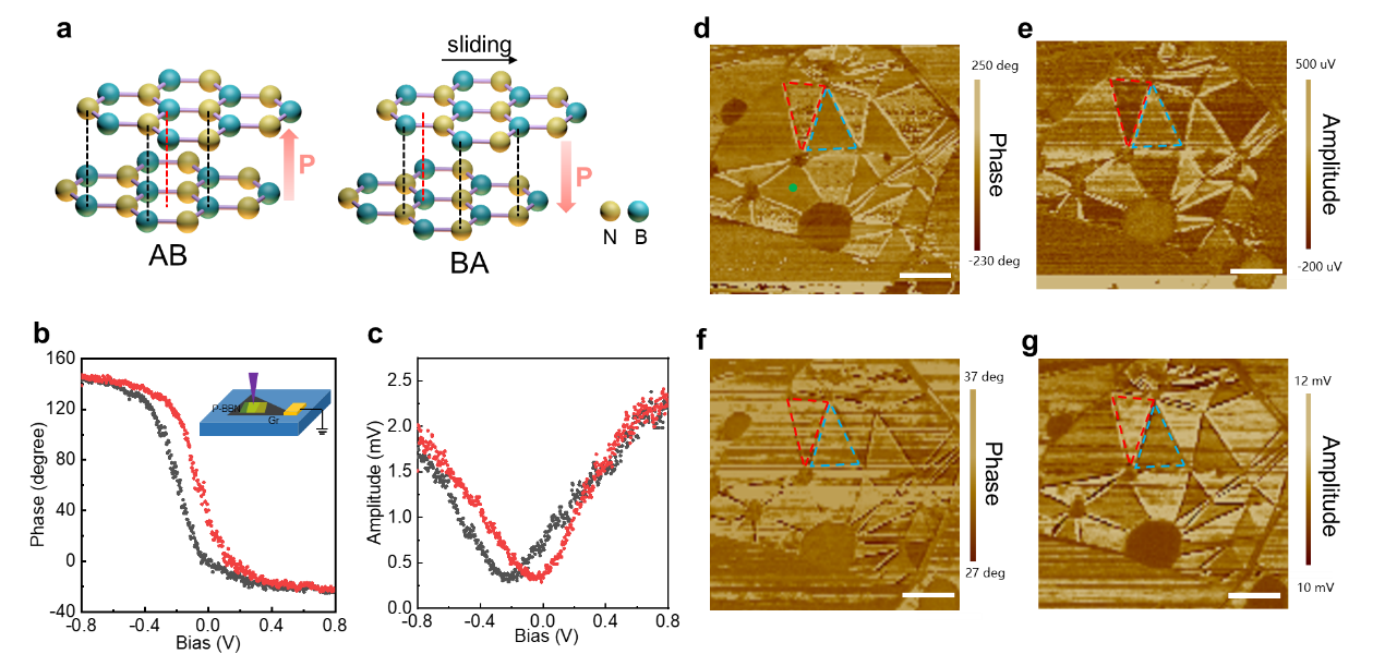 圖1展示的 PS-BN 的可切換鐵電疇。圖a展示了具有 AB 和 BA 堆疊順序的 PS-BN 結構圖,其中層間極化由硼(藍色)和氮(黃色)原子的排列產生。圖c和圖b展示了垂直 PFM 相位和振幅滯后回線分別與所施加的尖端偏壓成函數關系。圖d和圖e 展示了在少層石墨烯上的 PS-BN的PFM 振幅和相位映射,顯示出明顯的 AB 和 BA 鐵電疇。圖f和圖g 展示了PS-BN 在施加 1 V 直流電壓時的PFM 相位和振幅圖像,展示了可切換的鐵電疇。