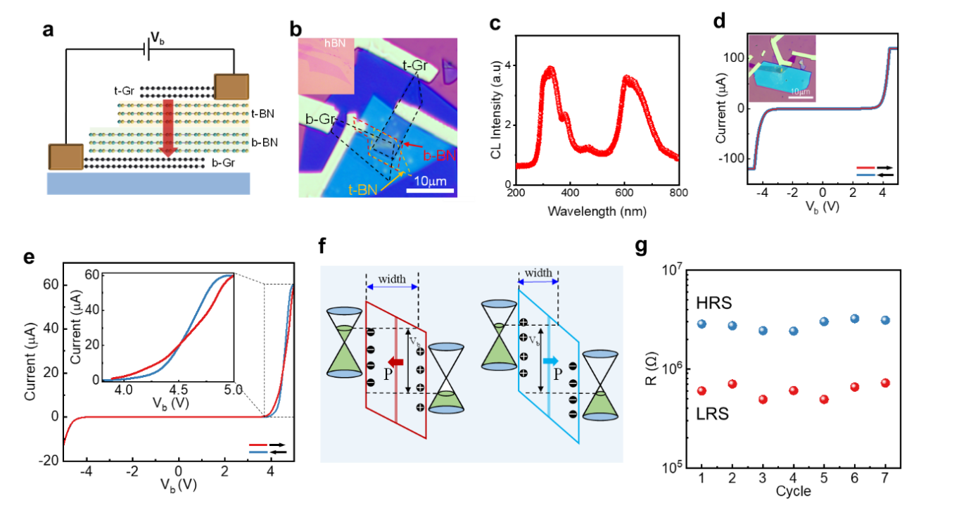 圖2展示了滑移憶阻器的隧穿電流特性。圖a展示了由石墨烯/PS-BN/石墨烯結構組成的滑移憶阻器示意圖。圖b展示了滑移憶阻器的光學照片。圖c展示了h-BN 的陰極熒光光譜,在 350 nm和 630 nm波長附近顯示出多個陰極熒光峰。圖d展示了石墨烯/h-BN/石墨烯隧穿器件的 I-V 曲線,沒有滯后現象。圖e展示了滑移憶阻器的 I-V 曲線,顯示在4 V左右存在穩定的回滯。圖f展示了具有兩種極化態 PS-BN 的滑移憶阻器能帶圖,顯示了可調的勢壘高度和寬度。圖g展示了在寫入電壓為5 V和擦除電壓為-5 V時,滑移憶阻器的耐久性。