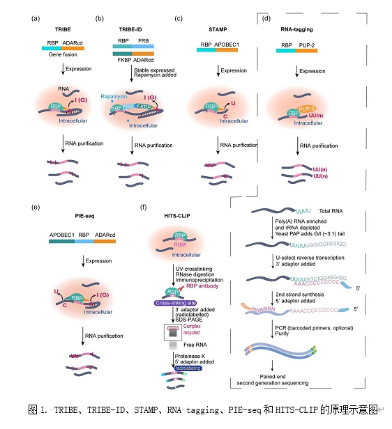 RNA結(jié)合蛋白(RNA-binding proteins,RBPs)是生物體內(nèi)強(qiáng)有力的多功能調(diào)節(jié)因子,通過在多個(gè)水平上調(diào)節(jié)基因表達(dá),在生物體發(fā)育、代謝和各種疾病中發(fā)揮重要作用。對(duì)RBP功能深入研究的需求,推動(dòng)了RBP-RNA相互作用檢測(cè)方法的快速發(fā)展。近年來,將RNA修飾酶(RNA modification enzymes,RME)與感興趣的RBP融合的檢測(cè)方法開發(fā)成為一個(gè)熱門研究方向。該文章綜述了包括作用于RNA的腺嘌呤脫氨基酶ADAR、末端核苷酸轉(zhuǎn)移酶TENT和激活誘導(dǎo)的胞嘧啶脫氨酶/載脂蛋白B mRNA編輯酶催化多肽樣(AID/APOBEC)蛋白家族脫氨酶在內(nèi)的,RNA修飾酶的生物學(xué)功能、生物化學(xué)活性和來自于酶自身與其結(jié)構(gòu)域和伴侶蛋白的底物特異性。同時(shí),討論了RNA修飾酶活性篩選系統(tǒng),以及具有工程酶活性的RNA修飾酶突變。此外,文章提供了基于RNA修飾酶和基于交聯(lián)和免疫純化(CLIP)的RBP靶標(biāo)檢測(cè)策略的基本原理、優(yōu)缺點(diǎn)和應(yīng)用的系統(tǒng)概述,包括基于A-G的RNA編輯酶鑒定RNA結(jié)合蛋白靶標(biāo)的TRIBE(Targets of RNA-binding proteins Identified By Editing)、基于RNA加尾酶的方法RNA Tagging、C-U的RNA編輯酶APOBEC1介導(dǎo)的編輯靶標(biāo)分析技術(shù)STAMP(Surveying Targets by APOBEC-Mediated Profiling)、CLIP-seq及其衍生技術(shù) (圖1)。