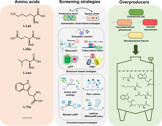 氨基酸已被廣泛應用于食品、動物飼料、制藥和化妝品行業。到2026年,全球氨基酸市場價值預計將達到296億美元,復合年增長率(CAGR)為6-8%。微生物發酵是氨基酸生產的主要方法,占全球氨基酸產量的80%。而發酵的關鍵是獲得高性能的發酵菌株。目前,氨基酸高產菌株的選育主要依靠構建突變庫和后續篩選,突變庫的建立方法已經較為成熟,而篩選策略往往決定了是否可以獲得理想的氨基酸高產菌株。