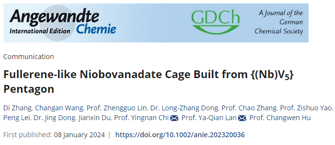 編輯:田柳 審核:王振華 閱讀次數:近期,北京理工大學化學與化工學院胡長文教授和遲瑛楠教授團隊在基于{Nb(V5)}五角星的類富勒烯鈮釩籠簇構筑方面取得重要進展。相關成果以“Fullerene-like Niobovanadete Cage Built from{Nb(V5)} Pentagon”為題,發表在化學領域國際頂級期刊《Angewandte Chemie International Edition》(2024, e202320036)上。北京理工大學化學與化工學院遲瑛楠教授和華南師范大學蘭亞乾教授為共同通訊作者,北京理工大學為第一通訊單位,化學與化工學院博士研究生張迪為該論文的第一作者。