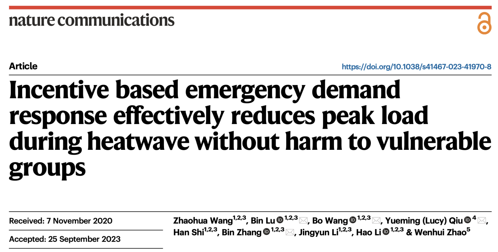 Zhaohua Wang, BinLu*, Bo Wang *,Yueming (Lucy) Qiu*,Han Shi, Bin Zhang*, Jingyun Li, Hao Li, Wenhui Zhao. Incentive based emergency demand response effectively reduces peak load during heatwave without harm to vulnerable groups. Nature Communications (2023).