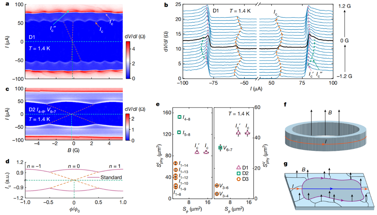 在本工作中,王秩偉團隊提供的高質量CsV3Sb5單晶樣品,林效團隊通過機械剝離技術獲得薄層納米片,并進一步基于微納加工制備了用于極低溫電輸運測量的量子器件,吳從軍團隊提供了理論計算和模擬。在此研究中,作者首先觀察到了無磁場超導二極管效應,如圖1所示,這表明在自發時間反演對稱性破缺背景下存在動態超導有序疇。超導二極管效應是指超導材料在一個方向上允許更大的超導臨界電流通過,而在另一個方向上則有所抑制。這種效應在量子信息處理、量子計算和量子通信等領域具有潛在的應用價值。令人驚奇的是,在外加磁場的作用下,觀察到了超導臨界電流隨磁場變化的周期性振蕩現象,表現出雙縫超導干涉圖案,如圖2所示,表明了CsV3Sb5的內部可能還存在著超流形成的環路。圖案的特性通過熱循環進行調制。這些現象被認為是周期性調制的超電流沿著受磁通量子量子化約束的特定疇邊界流動的結果。這些研究結果在一定程度上證明CsV3Sb5具有時間反演對稱性破缺的超導態,為在這個籠目超導體系材料中探索Majorana零模等奇異物理提供了新的思路。