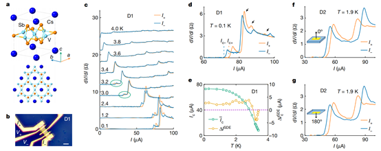 圖1. CsV3Sb5器件中的零場超導二極管效應。