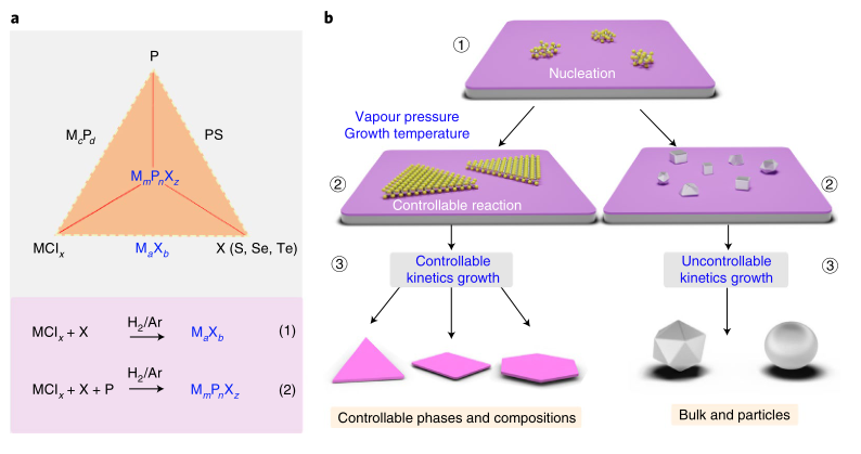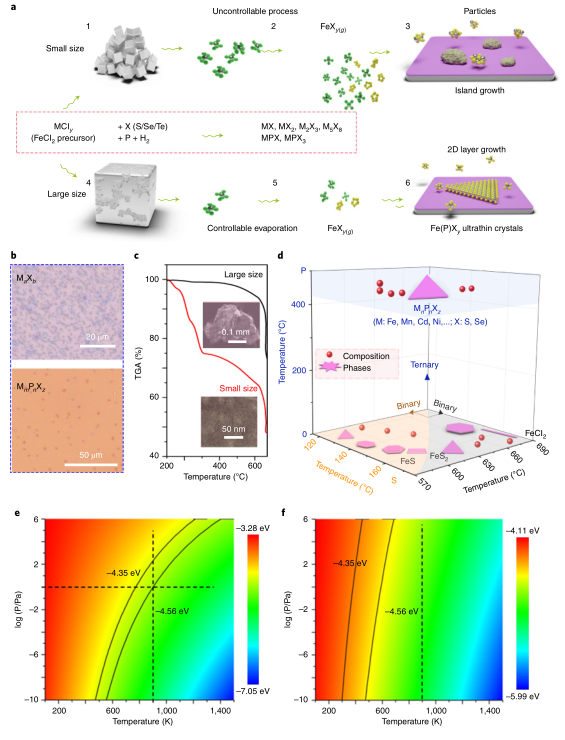 具體內(nèi)容如下:以Fe基化合物的制備為例,F(xiàn)e基的硫族二元化合物常見的包括FeX和FeX2,而FeX和FeX2又包括四方相和六方相等;三元磷硫化合物同樣包括不同的組成如MPX,MPX3等。在成核生長(zhǎng)過(guò)程中,不同組成和不同相之間相互競(jìng)爭(zhēng)。同時(shí),三元MmPnXz的生長(zhǎng)過(guò)程更加復(fù)雜,其化學(xué)反應(yīng)包括二元反應(yīng)(MaXb 、McPd 和 PX)和三元反應(yīng),MmPnXz 的制備不僅需要控制三元成分生長(zhǎng)的反應(yīng),同時(shí)需要避免形成二元MaXb,PX和McPd。另外,一些MaXb和MmPnXz具有非層狀結(jié)構(gòu),非層狀的外延生長(zhǎng)和島狀生長(zhǎng)模式之間還會(huì)相互競(jìng)爭(zhēng),為獲得原子層厚度的二維材料,需要控制反應(yīng)按照外延生長(zhǎng)模式進(jìn)行。