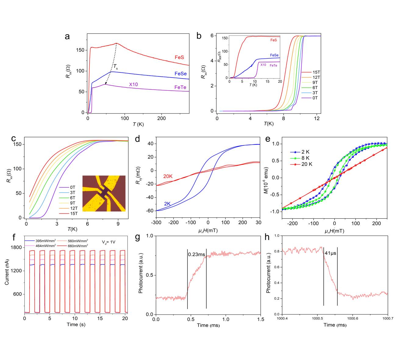 更重要的,這些二維材料展現(xiàn)出新奇的物理特性,使其成為基礎(chǔ)研究和實(shí)際應(yīng)用的新興平臺(tái)。研究表明,四方相FeX表現(xiàn)出超導(dǎo)特性。FeS、FeSe和FeTe的超導(dǎo)轉(zhuǎn)變溫度Tc值分別為3.3、7.3和11.0 K。不同于FeX,F(xiàn)eX2(FeS2)表現(xiàn)為鐵磁特性,其Tc值約為15 K。此外,F(xiàn)eTe2紅外探測(cè)器響應(yīng)速度優(yōu)于大多數(shù)已報(bào)道的二維材料。這說(shuō)明所合成不同組成的二維材料具有較高質(zhì)量,為進(jìn)一步研究物理性能和構(gòu)建異質(zhì)結(jié)構(gòu)如鐵磁/超導(dǎo)結(jié)等提供了平臺(tái)。