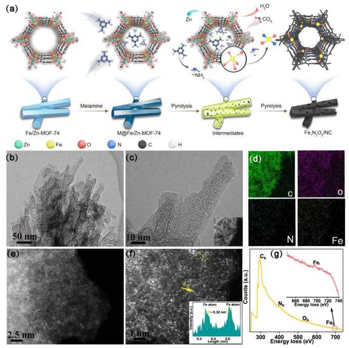 該工作選用Fe摻雜的Zn-MOF-74作為前體進行合成調控。Fe占據原MOF中的Zn位點,與有機配體中的O原子進行配位,進一步引入N源,在高溫煅燒條件下,Zn揮發,Fe-O配位團簇會被部分Fe-N配位取代,最終得到具有特殊配位結構的Fe1N2O2/NC 催化劑。通過TEM、HRTEM 表征結果能夠觀察到Fe1N2O2/NC良好的棒狀形貌。EDS mapping 圖像證明了催化劑中Fe,N,O,C的均勻分布,HAADF-STEM得到的EELS點譜進一步有力證明了在Fe1N2O2/NC中,Fe、O、N的共存,表明單個鐵被C內部的N和O共同錨定。HAADF-STEM圖像上孤立的亮點表明Fe單原子的高度分散。