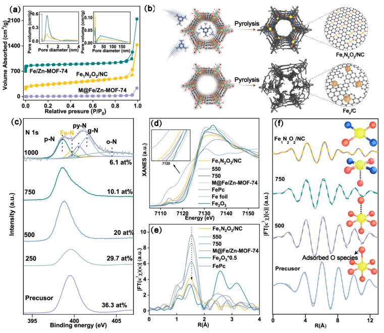 通過對引入N源和未引入N源等不同階段的BET和形貌等進行分析,得出N源的引入不僅能夠有助于形貌的維持,還有助于Fe單原子的形成。通過對引入N源的Fe/Zn-MOF-74進行不同溫度下(0℃,250℃,500℃,750℃及1000℃)煅燒產物的XRD,XPS及同步輻射表征以研究催化劑結構的生成過程。Fe k邊XANES光譜顯示,不同溫度下煅燒的樣品均在1-2 ?處都有一個主要的峰,可以歸因于第一殼層金屬- N /O。隨著反應溫度的升高,峰強度降低,峰位略微向左偏移,說明局部配位數相應降低,形成了混合Fe-N/O的配位構型。進行定量EXAFS分析表明,熱解前,Fe原子的第一殼層由Fe - O鍵組成,配位數為6 (5個來自有機配體,1個來自吸附的O物種)。500℃碳化后,吸附的O2或水被去除,中間體的平均配位數為5。當溫度進一步升高到750℃時,平均配位數降低到4.7,Fe-N散射路徑出現,表明氨中的N原子開始取代框架中的O原子。最終在1000℃下得到Fe1N2O2/NC催化劑,配位數約為4。