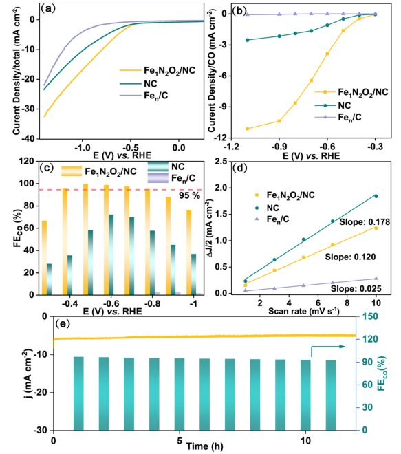 在CO2飽和的0.1 M KHCO3溶液中評估了催化劑的電化學CO2還原性能。從LSV曲線可以看出,與NC和Fen/C相比,Fe1N2O2/NC在-300 mV時對可逆氫電極(RHE)的起始電位更小,在測量電位范圍內的電流密度更高。在典型的三電極H型電池中進一步進行了不同電位下的CO2恒電位電解。在-0.7 V時,Fe1N2O2/NC的jCO高達6.5 mA cm-2,遠高于相同電位下的對比樣品 (NC為1.5 mA cm-2, Fen/C幾乎為0 mA cm-2)。Fe1N2O2/NC電催化劑在- 0.4 ~ - 0.8 V的極寬電位范圍內,FECO >的選擇性高達95%,值得指出的是,在- 0.5 V時,FECO高達99.7%,優于目前大多數報道的Fe單原子催化劑。在-0.7V電位下電解12h,CO法拉第效率和偏電流密度衰減可以忽略不計,展示出優異的穩定性。