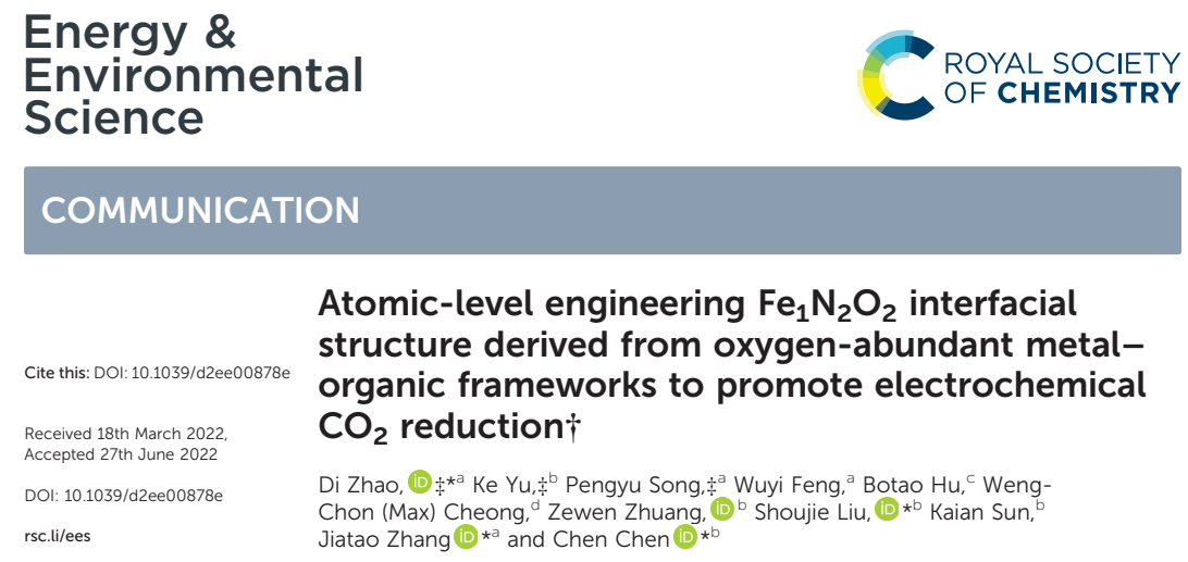 論文標題:Atomic-Level Engineering Fe1N2O2 Interfacial Structure Derived from Oxygen-Abundant Metal–Organic Frameworks to Promote Electrochemical CO2 Reduction