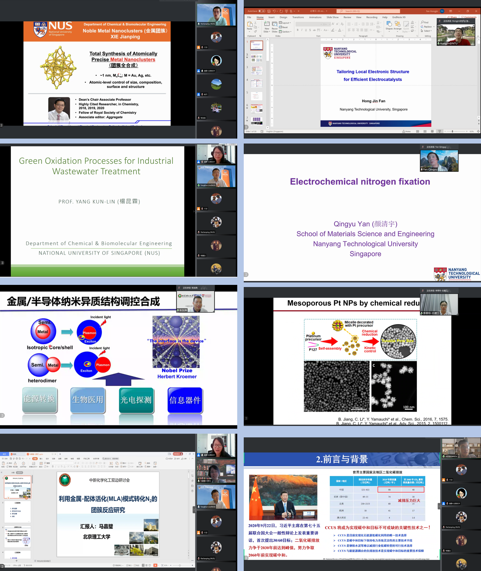 為了深化雙方在各個領域的合作,化學與化工學院在國際交流與合作處的大力支持下,在云端組織了中新化學化工雙邊研討會,邀請了新加坡國立大學、南洋理工大學以及我?;瘜W、化工領域的專家、老師通過線上會議的形式,交流學術成果,探討合作交流。首先,化學與化工學院院長張加濤回顧了北理工與新加坡高校合作交流的歷史,希望雙方進一步加強在師資培養與科研方面的交流。新加坡國立大學的Jianping Xie,Kun-Lin Yang教授,以及南洋理工大學的Hong jin Fan,Qingyu Yan教授分別介紹了他們在納米團簇合成、工業廢水的綠色處理過程、電催化產氫以及固氮方面的科研進展,北京理工大學的張加濤、李翠玲、馬嘉璧、劉賀磊四位教授介紹了他們在納米結構合成、多孔金屬電催化、原位團簇化學、碳捕獲技術方面的科研工作。報告人同與會師生進行了熱烈互動。