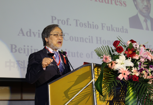 本屆大會主席的名譽主席福田敏男教授發表講話。他對各支持單位和與會人員對大會的支持表示感謝,并鼓勵參會的青年學者利用大會契機,積極交流思想和拓展國際視野,為開創機電一體化與自動化技術的新成果奠定基礎。會上,柴天佑教授、小管一弘教授、Ken Goldberg教授,楊慶新等教授先后致辭,預祝會議圓滿成功,并對與會人員的到來表示歡迎。
