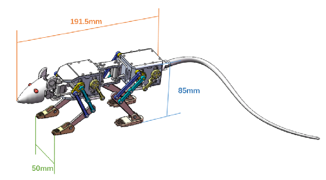 本項目機器鼠全身共12個主動自由度(腰部2個,單腿2個,頭部2個),4個足端被動自由度,機器鼠鼠長度200mm(無尾),寬度為50mm,總重量358g(包括電氣部件),實現(xiàn)了高度的集成化和輕量化設(shè)計。