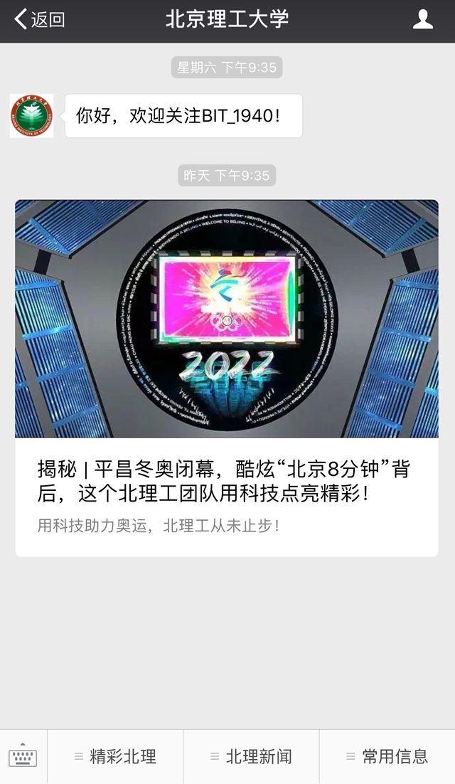 值得一提的是,25日,作為“北京理工大學微信訂閱號”發出的第一條推送《揭秘 | 平昌冬奧閉幕,酷炫“北京8分鐘”背后,這個北理工團隊用科技點亮精彩!》,獲得了“10萬+”的閱讀量。