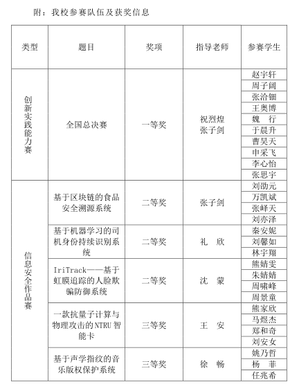 7月29日,第十一屆全國大學(xué)生信息安全競賽在武漢大學(xué)落下帷幕。由我校計算機(jī)學(xué)院副院長祝烈煌帶隊,張子劍、沈蒙、王安、徐暢、禮欣指導(dǎo)的參賽隊伍再次取得佳績,共獲“創(chuàng)新實踐能力賽”(以下簡稱“創(chuàng)新賽”)一等獎、網(wǎng)絡(luò)安全創(chuàng)新單項獎;“信息安全作品賽”(以下簡稱“作品賽”)二等獎3項、三等獎2項。