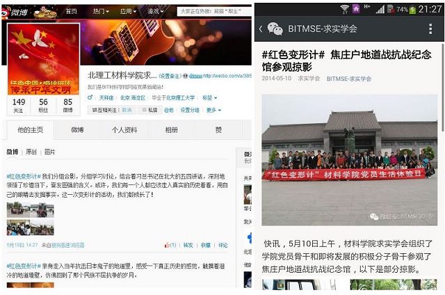 此次活動在材料學院求實學會官方微博和微信公眾平臺進行了播報,參加活動的同學也在線表達了感悟和心得。新媒體在學生黨建工作中的運用,傳播和擴大了教育效果,使更多的同學感同身受的接受了一次紅色教育。