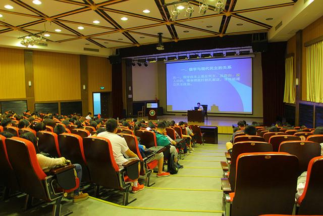 劉國民教授先從儒家思想的精髓出發,闡述了儒學與我國民主之間的聯系,并從學術角度探討了“民主”的內涵,分析了民主政治的現狀,提出了我國踐行人民民主的現實意義。又從儒家的德治政治角度,對民主踐行者提出了更高的素質要求。劉教授慷慨激昂地演講贏得了在座所有老師與學生的熱烈掌聲。