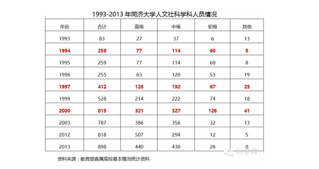 對于同濟大學而言,在過去的20年里,增設了不少新的人文社會科學學科院系,文科教師隊伍規模不斷擴大,學校也逐步從多科走向了綜合。但是,從下表可以發現,同濟大學人文社會科學教師人數增長主要出現在1993-1994年,1996-1997年以及1999-2000年,這三個年份都出現了超出常規的增長,增幅分別達到212%(176人)、61.6%(157人)和54.3%(287人),其他時間段則基本維持了師資隊伍的穩定。其中1996(上海城市建設學院和上海建筑材料工業學院)和2000年(與上海鐵道大學合并)兩次文科教師的超常增長都并非由于學校的內生增長,這種超出常規的方式,很難控制師資隊伍的質量,加上人員整合和磨合需要過程,導致了同濟大學文科的發展勢頭不如清華、交大和浙大等兄弟高校。