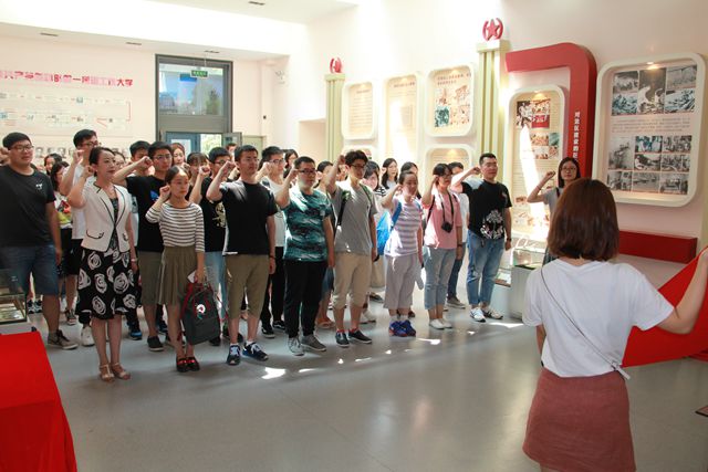 參觀結束后,在校史館大廳,全體黨員面向黨旗重溫入黨誓詞。在黨員代表遲昕鳳同志的帶領下,全體黨員舉起右手進行宣誓:“我志愿加入中國共產黨……”,莊嚴而有力的聲音回蕩整個校史館。通過重溫入黨誓詞,使每一位黨員的內心都受到了新的觸動。