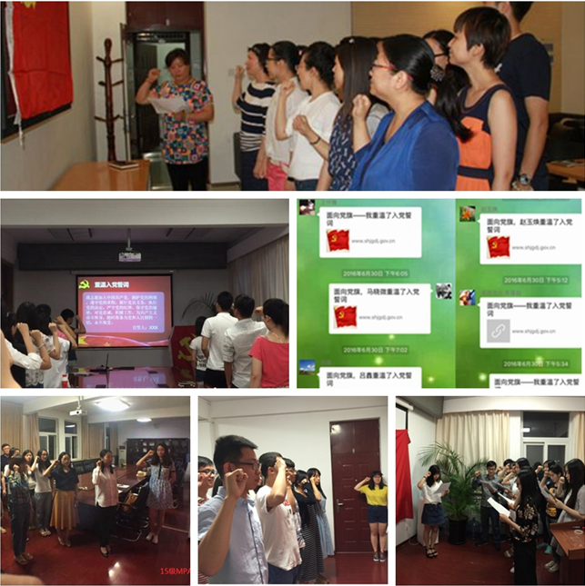 按照學(xué)院黨委開展集體學(xué)習(xí)工作的要求,學(xué)院11個(gè)教工支部、30個(gè)學(xué)生支部全部組織開展了“重溫入黨誓詞”和參觀學(xué)習(xí)活動(dòng)。特別是教工支部中的很多留學(xué)歸國的青年教師親筆撰寫對(duì)入黨誓詞再認(rèn)識(shí)的心得體會(huì),一些教工黨支部在微信群里以在線的方式進(jìn)行“面向黨旗,重溫入黨誓言”活動(dòng),不忘入黨初心,爭做合格黨員。