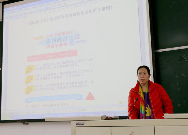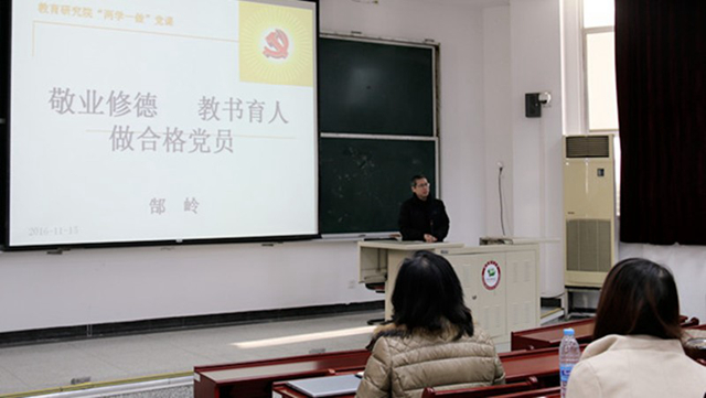 學院高等教育研究所黨支部書記郜嶺老師講了“兩學一做”專題黨課。郜嶺老師以“敬業修德、教書育人、做合格黨員”為主題,結合自身的學習與從教經歷,與全體黨員師生分享了一名好教師、一名好黨員的心路歷程。