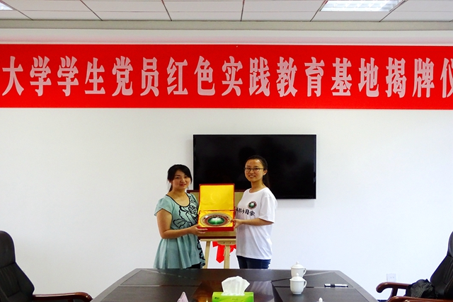 北京理工大學學生代表孫若愚代表學校向金寨縣縣委黨校贈送紀念品,印有校徽的盤子象征著合作培養人才與不斷進取。