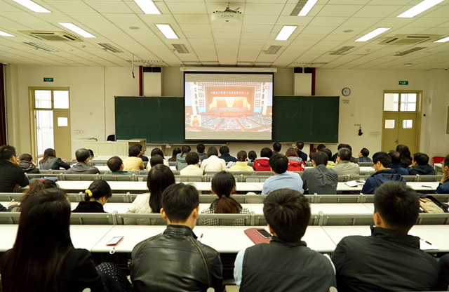 黨的十九大是我們黨在全面建成小康社會決勝階段、中國特色社會主義關鍵時期召開的一次非常重要的大會,是全黨全軍全國各族人民政治生活中的大事。在觀看直播現場,廣大師生邊看邊做好記錄,不時以熱烈的掌聲回應習近平總書記的精彩報告。