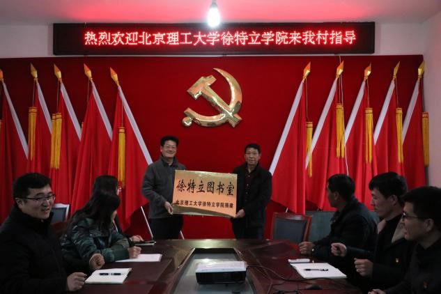 離開重機轟鳴的生產車間,實踐團成員們興趣愈增,踏入煥然一新的胡堡村,在村委會會議室中舉行了徐特立圖書室掛牌儀式。教育扶貧是高校參與到國家精準扶貧戰略的重要一環,發揮高校教育能力,以教育助力扶貧攻堅,要想談扶貧,必先扶志與扶智。而特立學院贈送的畫冊與圖書,也必將同這圖書室一起,見證更多牢記使命,勇擔重任的北理工人的付出,見證方山教育事業的騰飛!