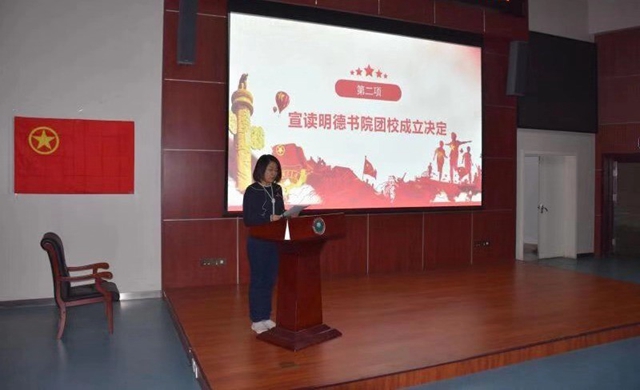 2019年9月,明德書院團委新增團員220人,根據《團章》基層組織建設相關要求,增設10個基層團支部,分別為德澤團支部、德遠團支部、德祎團支部、德音團支部、德翊團支部、德曜團支部、德清團支部、德昭團支部、德正團支部、德懿團支部。明德書院副院長李冰為10個新生團支部授團旗,精工書院、睿信書院、求是書院以及人文與社會科學學院的專職團干部為新生團員代表授團徽。儀式的最后,全體到場人員重溫《入團誓詞》。