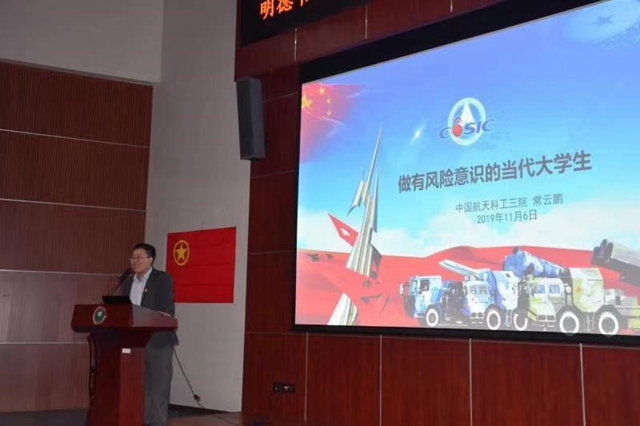 隨后,北京理工大學優秀校友,現就職于中國航天科工第三研究院,從事風險管理與內部控制管理工作的常云鵬學長進行主題為《做有風險意識的當代大學生》的團校第一課。