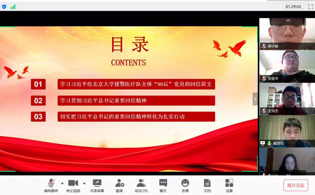 在學習討論環(huán)節(jié)中,支部成員疏亞倫領學了習近平總書記給北京大學援鄂醫(yī)療隊全體“90后”黨員重要回信精神,部分團員代表結(jié)合自己在疫情期間的所見所感,分享了對總書記回信精神的學習心得。隨后,同學們圍繞如何踐行總書記回信精神與德育導師項昌樂院士進行深入交流。