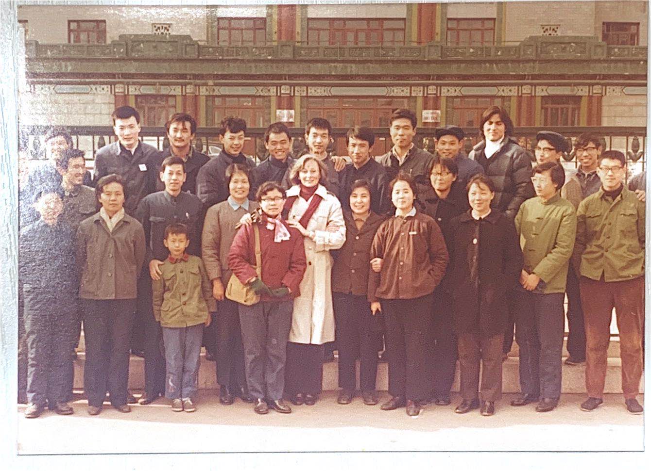 我校第一位外籍教師凱瑟琳·王(第一排右六)與部分外語教師及78級英語專業學生合影