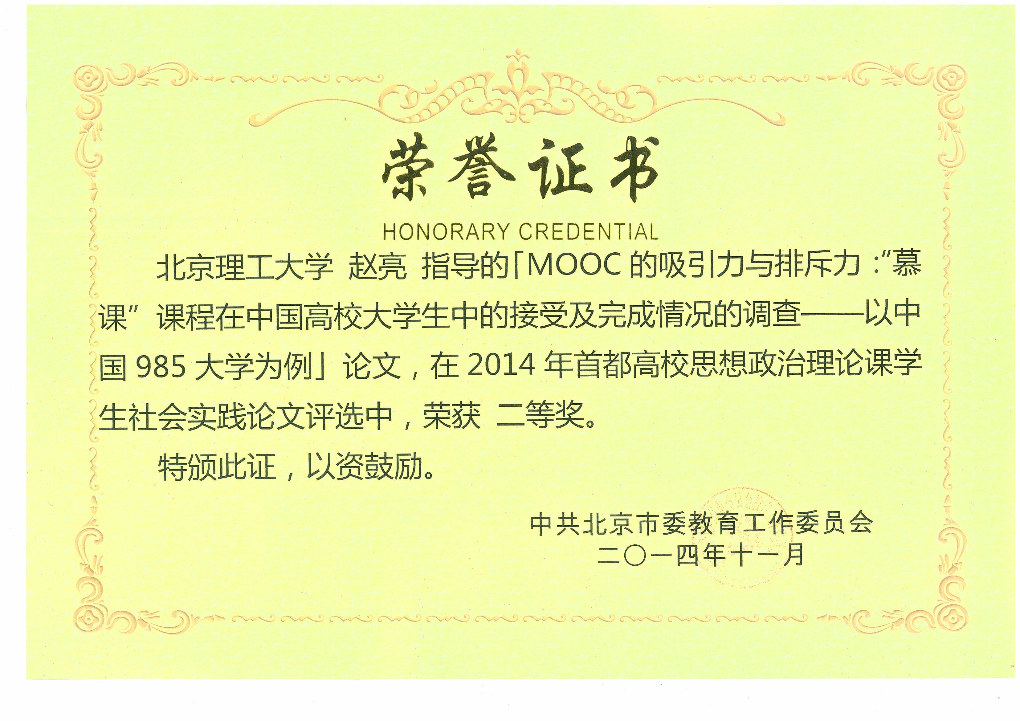 11月24日,北京市教育工作委員會組織開展的2014年首都高校思想政治理論課學生社會實踐優秀論文征集與評選活動結束,北京理工大學再次獲績,榮膺優秀組織獎,這是我校連續5年榮獲此項榮譽。同時,郭麗萍老師指導的論文《北京市垃圾分類、處理與回收現況及對策研究》榮獲學生社會實踐優秀論文一等獎,作者為軟件工程專業黃凌云、王遠明、李奕鋆;趙亮老師指導的論文《MOOC的吸引力與排斥力:“慕課”課程在中國高校大學生中的接受及完成情況的調查——以中國985大學為例》獲二等獎,作者為物理菁英班裴逸青、馬雪、于茉濃;季雨老師指導的論文《中國體育人才體教結合良性培養路徑研究——以北理工足球隊的成功為例》獲二等獎,作者為會計學專業(中外合作辦學)宋浩哲、青蕓、王雨竹。