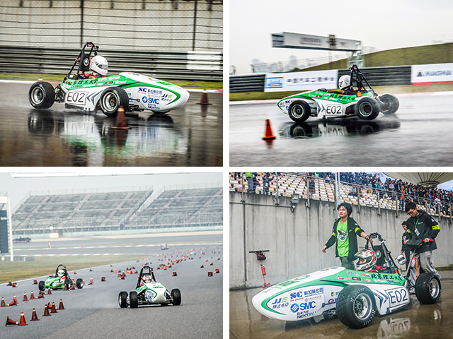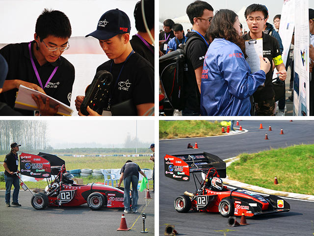 雖然首個進入動態(tài)項目,卻略遇不順。11月的上海,陰雨綿綿,賽程中一直伴隨著小雨,濕滑的賽道不僅影響賽車的性能發(fā)揮,也給賽車手的駕駛增加危險性,帶給車隊巨大的挑戰(zhàn)。而此時已有數輛賽車因雨水滲透引發(fā)故障,賽車動力中斷或無法啟動,導致退賽。但我校經驗豐富的賽車手和銀鯊穩(wěn)定的賽道表現,在最后的雨戰(zhàn)中以幾乎零失誤(包括脫離賽道、撞樁筒等)順利完成了21公里的耐久性測試。加之輕量化的賽車設計,也讓銀鯊賽車在經濟性測試中得到了滿分。