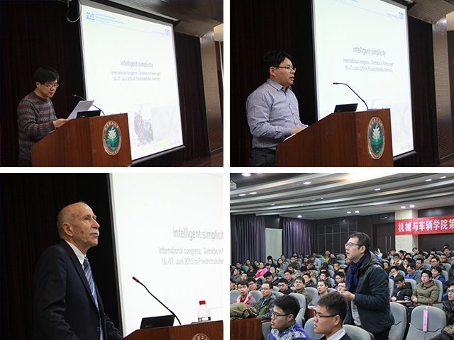 特邀嘉賓Hoehn教授以“intelligent simplicity”為題為研究生做了學術報告。Hoehn教授針對我國汽車排放污染、交通擁堵等問題,向同學們介紹了智能簡單化的車輛傳動系統(tǒng)的設計思想,利用兩個三缸內(nèi)燃機代替?zhèn)鹘y(tǒng)的六缸內(nèi)燃機,滿足汽車行駛要求的同時,以更高效的傳動系統(tǒng),達到節(jié)能減排的目的。Hoehn教授將國際前沿的科學技術與研究生們分享,并在講座結(jié)束后與同學們交流互動,得到了同學們的陣陣掌聲。