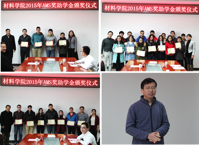 首先,頒發的材料學院2015年度AMS獎助學金,佛山先進機械設備有限公司(AMS)作為國內從事表面工程技術的知名企業,事業蓬勃發展的同時不忘心系教育事業,從2005年起連續十一年在材料學院設立獎學金,也是為材料學院捐贈歷史最長的企業,每年捐贈五萬元,累計捐贈五十五萬元,300余名學生得到獎勵和資助。