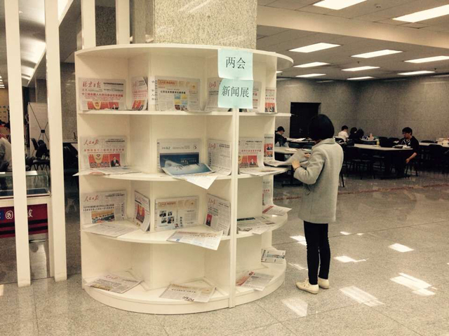 2016年是“十三五”規劃的開局之年,隨著2016年全國兩會的順利召開,為更好地學習貫徹兩會精神,圖書館以“世界讀書日”為契機,利用館內豐富的報刊資源在圖書館一層休閑區,向讀者展示有關“兩會”專題的新聞報道,以使讀者更加便捷、集中地了解兩會熱點、學習兩會精神,在提高學術造詣的同時,加強精神建設,關心時事,完善自身修養。