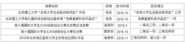 2016年11月,“仿生老鷹撲翼式飛行器”及 “汽車落水情況下協助逃生系統”團隊在北京市教育委員會舉辦的2016年北京地區高校大學生優秀創業團隊評選中表現優異,榮獲“三等獎”,被授予“北京地區高校大學生優秀創業團隊”稱號;“讓世界充滿愛(手語翻譯大師)”團隊獲得“潛力獎”。同時三支隊伍受邀作為北京理工大學代表團隊參加了2016年12月3日-4日期間在北京工業大學耿丹學院舉行的第五屆大學生科技創新作品與專利成果展示推介會。會上三組作品受到了參會專家及企業代表的一致好評,并提出了眾多寶貴意見。