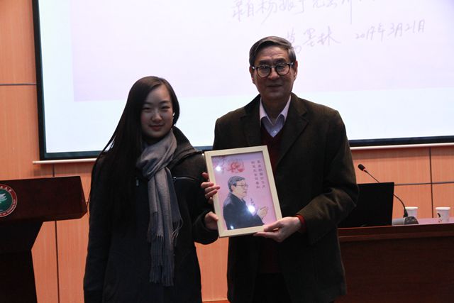 現(xiàn)場學(xué)生也向葛院士贈送了精心設(shè)計的紀念品——葛墨林先生畫像。“黑發(fā)積雪織日月,粉筆無言寫春秋”,是對葛院士教書育人,潛心學(xué)術(shù)的真實寫照。