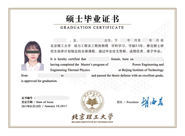2016年春季,北理工自主設計的新版中英文學位證書的頒發,在社會以及學生中引起了一定反響。為了保持研究生“兩證”(畢業證書與學位證書)的一致性,在校長胡海巖院士、副校長兼研究生院院長方岱寧院士關心指導下,研究生院常務副院長王軍政多次主持開會討論,副院長兼培養處處長唐勝景具體負責,與設計與藝術學院設計團隊、以及外國語學院、留學生中心、國際合作交流處的專家教授一起,經過多次修改、不斷優化設計方案,最終確定了新版研究生中英文畢業證書。