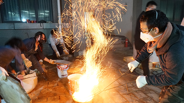 編輯:歐陽哲 審核:王東聲 閱讀次數:“出窯啦!”伴隨著幾聲歡呼,一個個剛剛熔融的陶藝作品,被從窯中夾出,放入裝有可燃物的鐵桶中時,頓時煙火翻騰,釉色金燦,給人一種美輪美奐的感覺,火焰升騰的畫面,令圍觀的學生們激情澎湃,無比欣喜。以上一幕并不是發生在遙遠的瓷都或者陶鄉,而就發生在北京理工大學良鄉校區理學樓東側一隅,這里矗立起一座不大的陶窯,在這個名為“樂燒workshop”的課程里,北理工學子在老師帶領下,親自燒制自己設計的陶藝作品。
