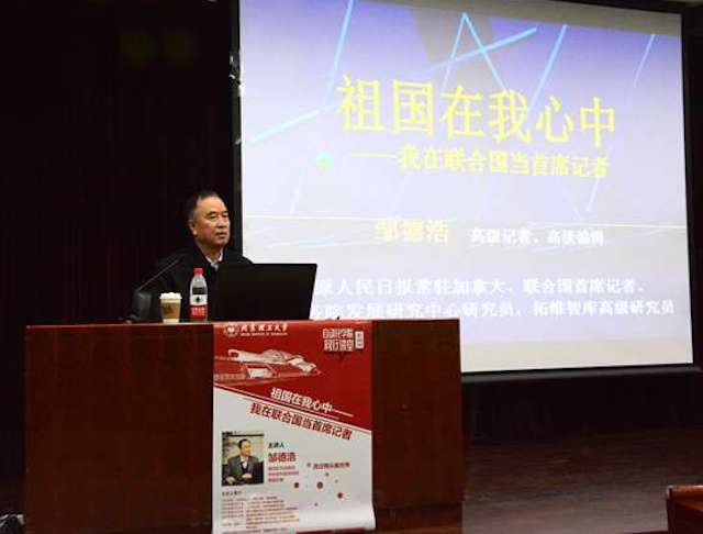 編輯:賀小琴 審核:張宏亮 閱讀次數:2017年12月14日晚,“祖國在我心中——我在聯合國當首席記者”主題講座,在中關村校區研究生樓101報告廳成功舉辦。本次講座由《人民日報》駐聯合國原首席記者鄒德浩作為主講嘉賓,由自動化學院副書記副院長張宏亮主持。