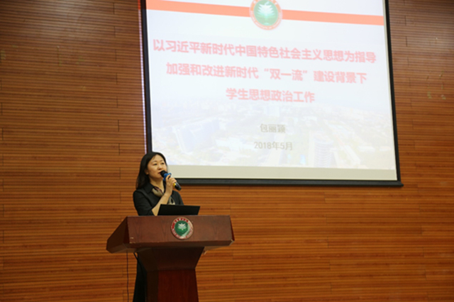 包麗穎以《以習(xí)近平新時(shí)代中國特色社會主義思想為指導(dǎo)加強(qiáng)和改進(jìn)新時(shí)代“雙一流”建設(shè)背景下學(xué)生思想政治工作》為題作專題報(bào)告。包麗穎強(qiáng)調(diào),新的時(shí)代背景下黨對高校辦學(xué)育人提出了新要求,新時(shí)代學(xué)生思想政治工作要以習(xí)近平新時(shí)代中國特色社會主義思想、習(xí)近平教育思想和全國高校思想政治工作會議精神為開展依據(jù)。關(guān)于新時(shí)代學(xué)生思想政治工作基本思路,一要聚焦根本性、基礎(chǔ)性問題,注重內(nèi)涵建設(shè)、內(nèi)涵發(fā)展,強(qiáng)化政治意識、質(zhì)量意識;二要堅(jiān)持“繼承發(fā)揚(yáng)與開拓創(chuàng)新相結(jié)合,系統(tǒng)推進(jìn)與重點(diǎn)突破相結(jié)合,資源整合與全員育人相結(jié)合,學(xué)生受益與學(xué)校發(fā)展相結(jié)合”;三要圍繞立德樹人根本任務(wù),鞏固深化全員全過程全方位育人格局;四要構(gòu)建思想深度、工作力度、情感溫度、成果效度有機(jī)統(tǒng)一的新時(shí)代思想政治工作體系;五要以務(wù)實(shí)管用的思想引領(lǐng)、價(jià)值塑造、成長服務(wù)為領(lǐng)軍領(lǐng)導(dǎo)人才培養(yǎng)打好堅(jiān)實(shí)基礎(chǔ)。